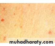 At the end of the first week, a rash may appear on the upper abdomen and on the back as sparse, slightly raised, rose-red spots, which fade on pressure. It is usually visible only on white skin.