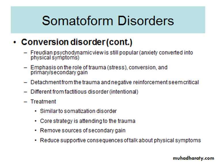 Historically, both somatoform and dissociative disorders used to be categorized as hysterical neurosisin psychoanalytic theory neurotic disorders result from underlying unconscious conflicts, anxiety that resulted from those conflicts and ego defense mechanisms