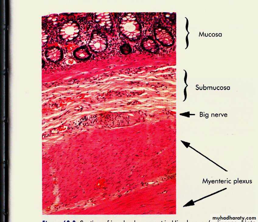 • Hirschsprung's disease• Caused by an absence of ganglia in the myenteric plexus usually of the distal hind gut.